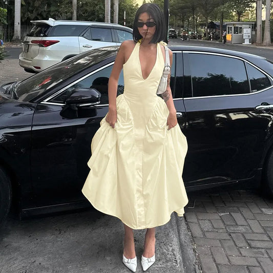 Backless Halter V-Neck Maxi Dress – Elegant Flirty Evening Party Dress for Summer