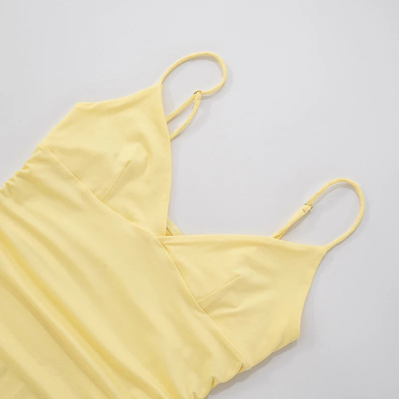 Bright, fun, and effortlessly flattering — this spaghetti strap mini dress brings a fresh, youthful vibe to your wardrobe. The soft V-neckline, ruched bodice, and low-waist pleated skirt create a playful skater silhouette that moves with you and highlights your shape beautifully.